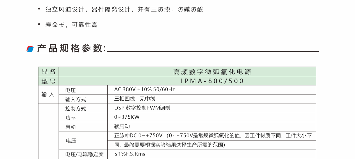 該電源為脈沖電源,為微弧氧化等需要脈沖的電壓和電流的情況而設(shè)計(jì)。電源采用高頻隔離設(shè)計(jì),采用先進(jìn)的DSP控制,輸出電壓穩(wěn)定,不因輸入電壓波動而變化。輸出頻率和占空比可調(diào)。