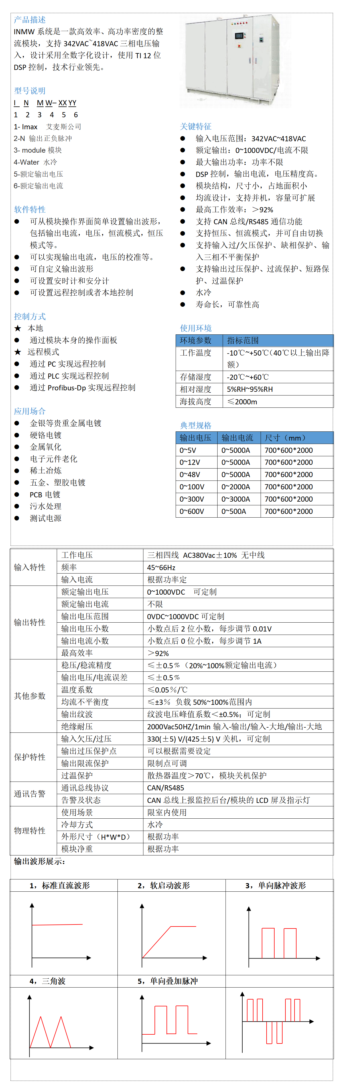 INMW系統(tǒng)是一款高效率、高功率密度的整流模塊,支持342VAC~418VAC三相電壓輸入,設(shè)計采用全數(shù)字化設(shè)計,使用TI 12位DSP控制,技術(shù)行業(yè)領(lǐng)先。