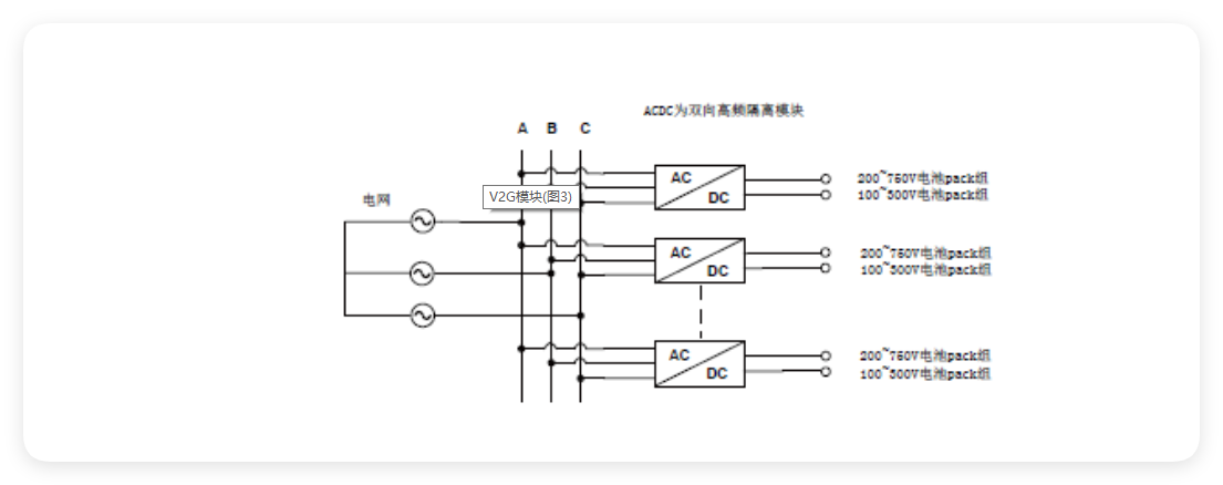 高頻隔離技術(shù)取代傳統(tǒng)的工頻隔離方式,顯著提高了系統(tǒng)效率,降低了系統(tǒng)成本,并減小了占地面積,實(shí)現(xiàn)了節(jié)能增效的目標(biāo)。以下為雙向高頻隔離電源用于電池化成與分容的解決方案示意圖,電池pack分組接入模塊,省去了工頻變壓器,系統(tǒng)效率更高,尺寸更小。