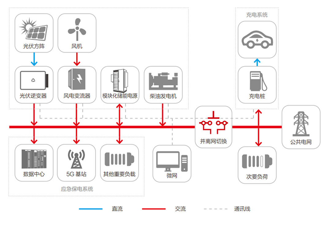 支持離網(wǎng)黑啟動(dòng)功能,保障停電狀態(tài)下的應(yīng)急電源供電 光儲(chǔ)微網(wǎng)模式下,平滑新能源輸出,保障微網(wǎng)穩(wěn)定運(yùn)行 儲(chǔ)能系統(tǒng)可作為備用電源,保障微網(wǎng)安全可靠