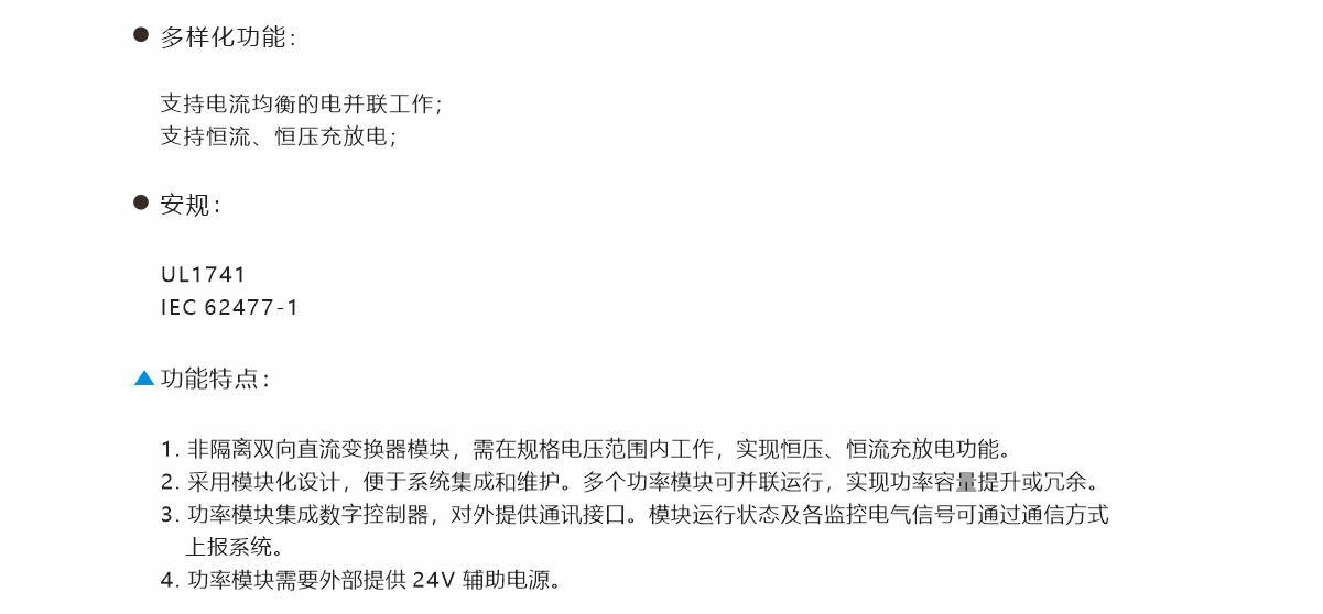 該產(chǎn)品為非隔離雙向直流變換器模塊,模塊化設(shè)計(jì)便于系統(tǒng)集成和維護(hù);多個(gè)功率模塊可并聯(lián)運(yùn)行,實(shí)現(xiàn)功率容量提升或冗余。功率模塊集成數(shù)字控制器,對(duì)外提供通訊接口。