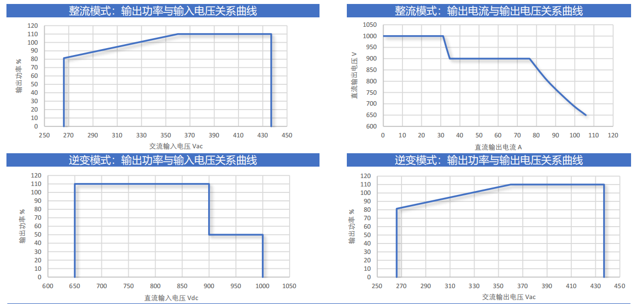 - 輸出交流電壓&輸出功率:360Vac~437Vac:62.5kW恒功率輸出;360Vac~260Vac:輸出線性降至50kW