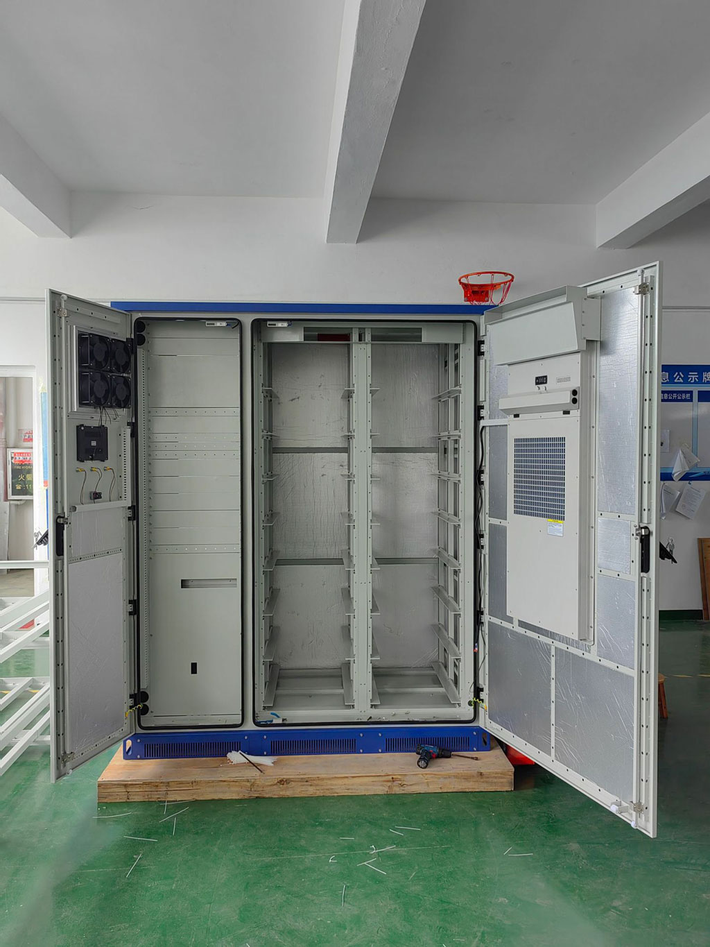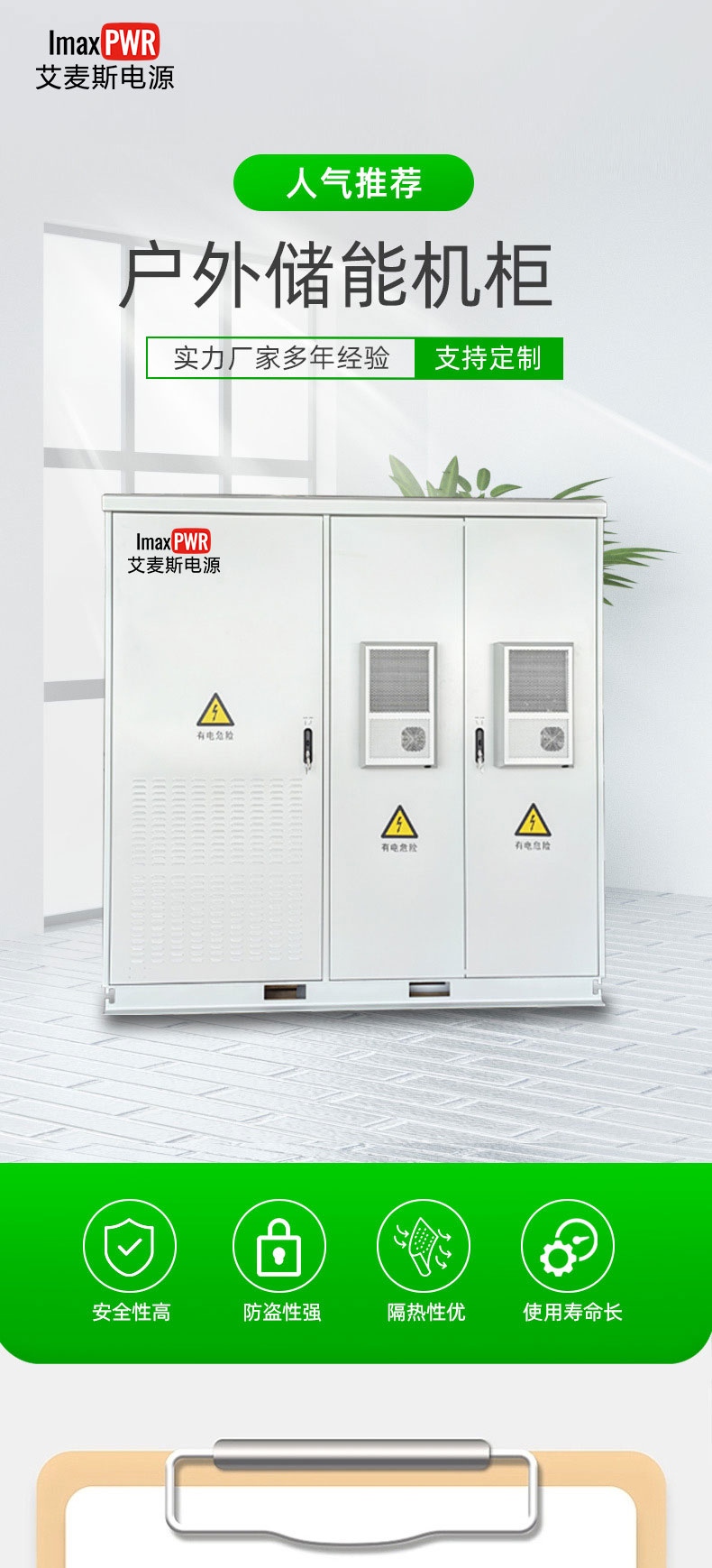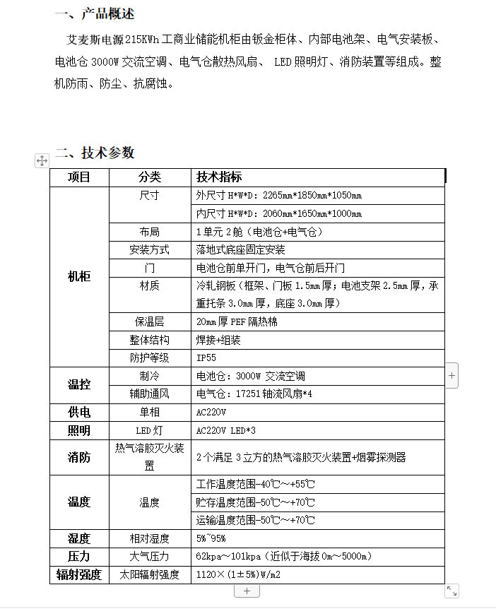 艾麥斯電源 215KWh 工商業(yè)儲(chǔ)能機(jī)柜由鈑金柜體、內(nèi)部電池架、電氣安裝板、電池倉(cāng) 3000W 交流空調(diào)、電氣倉(cāng)散熱風(fēng)扇、LED 照明燈、消防裝置等組成。整機(jī)防雨、防塵、抗腐蝕。