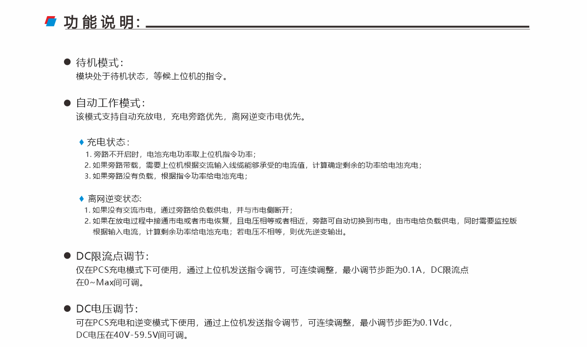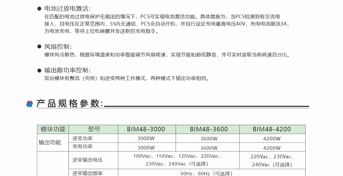 BIM系列3000-3600-4200W為多功能雙向PCS模塊,采用高效軟開(kāi)關(guān)專利拓?fù)浜蛿?shù)字控制技術(shù),集成純正弦波逆變器、大功率充電器、UPS旁路、RS485和CAN通訊端口、并機(jī)等功能。